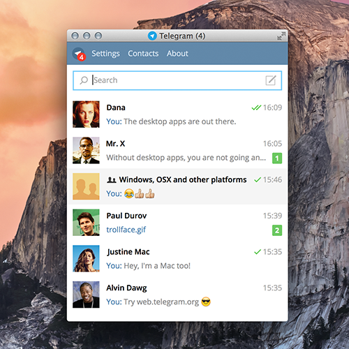The official Telegram app for Windows, OSX and Linux is now available in compact mode — you can resize the window so that only a single column remains. This makes it easier to use Telegram on smaller desktop or laptop screens.