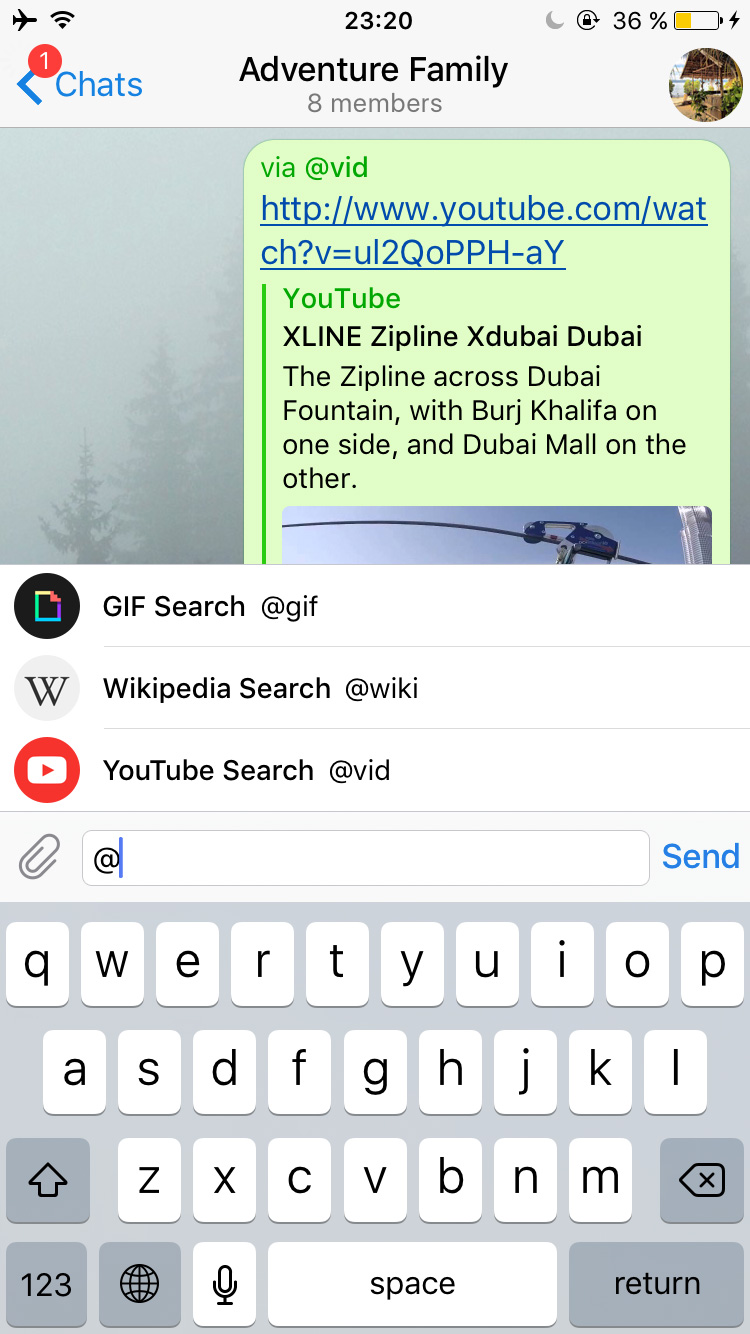 With the new inline mode, bots become omnipresent and can be used as a tool in any of your chats, groups or channels – it doesn't matter, whether the bot is a member or not. Inline bots can help you with dozens of different tasks, like quickly sending relevant GIFs, pictures from the Web, YouTube videos, Wikipedia articles, etc.