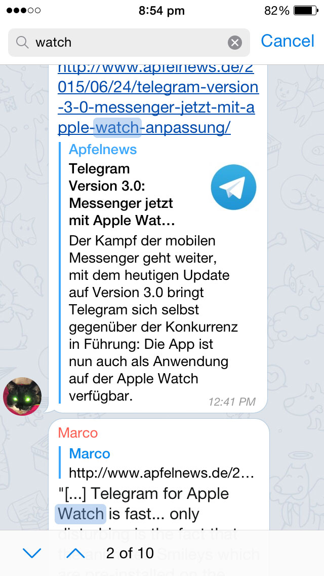 All of your communications in Telegram are already instantly searchable with the multi-purpose search field, but now you can also search for messages in specific chats. Just tap on the name of the chat in iOS or toggle the Actions menu in Android: