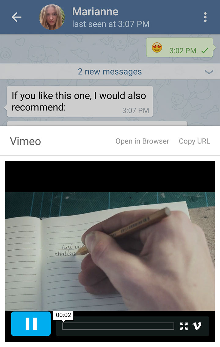 The new version of Telegram allows you to play media from services like YouTube, Vimeo or SoundCloud directly from Telegram – without having to leave the app. Just tap on the preview of a link to an external media to view the video or listen to the audio file (speaking of audio files, they are now beautifully rendered and played in chats).