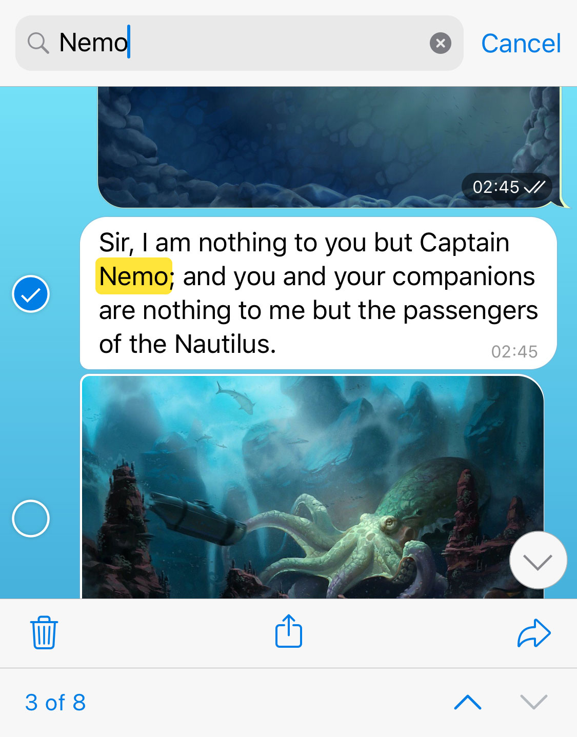 The Search function allows you to easily jump between messages containing a keyword – or sent by a particular person, or even from a certain day. Tapping the bottom bar will now switch to list view in case you want to see all the results on one page.