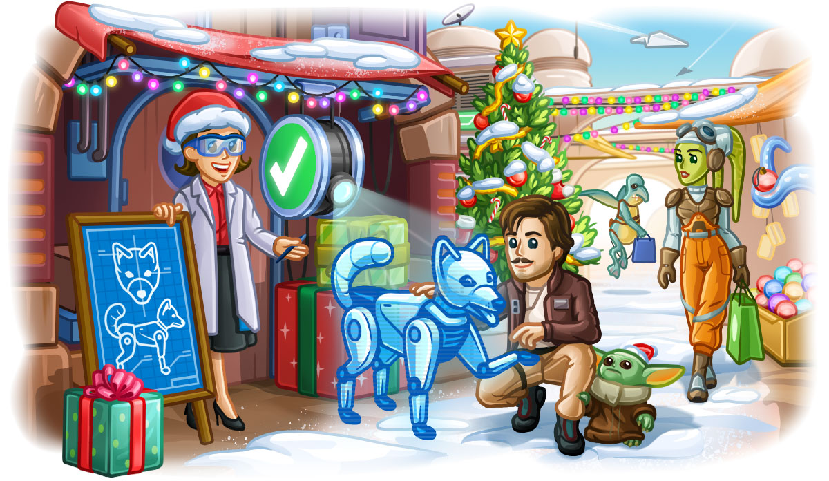Dude in a jacket inspecting the hologram of a mechanical dog to verify it's built according to the blueprints provided.